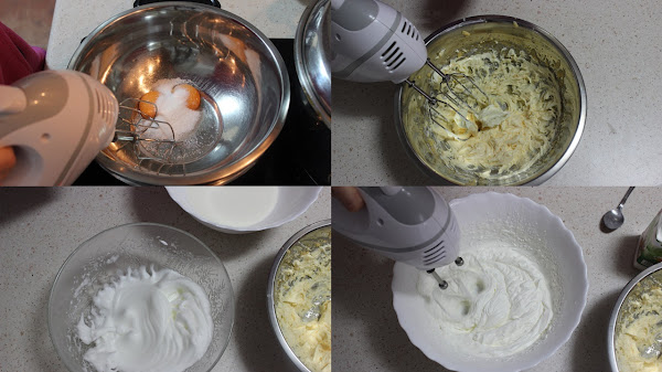 Las mezclamos la nata montada (crema de leche) con el mascarpone, y las claras a punto de nieve con movimientos envolventes. Lo ponemos en una manga pastelera.