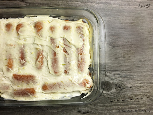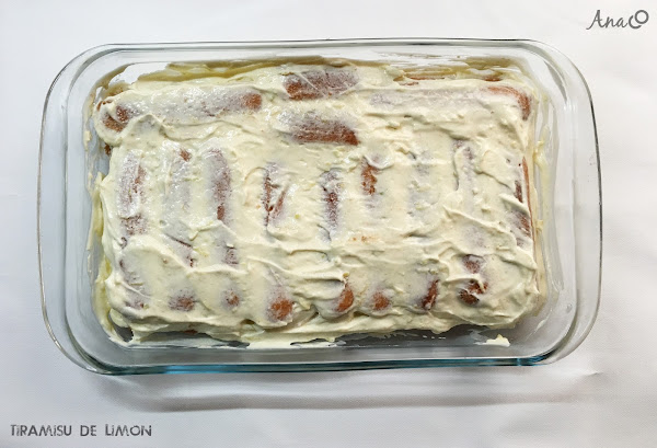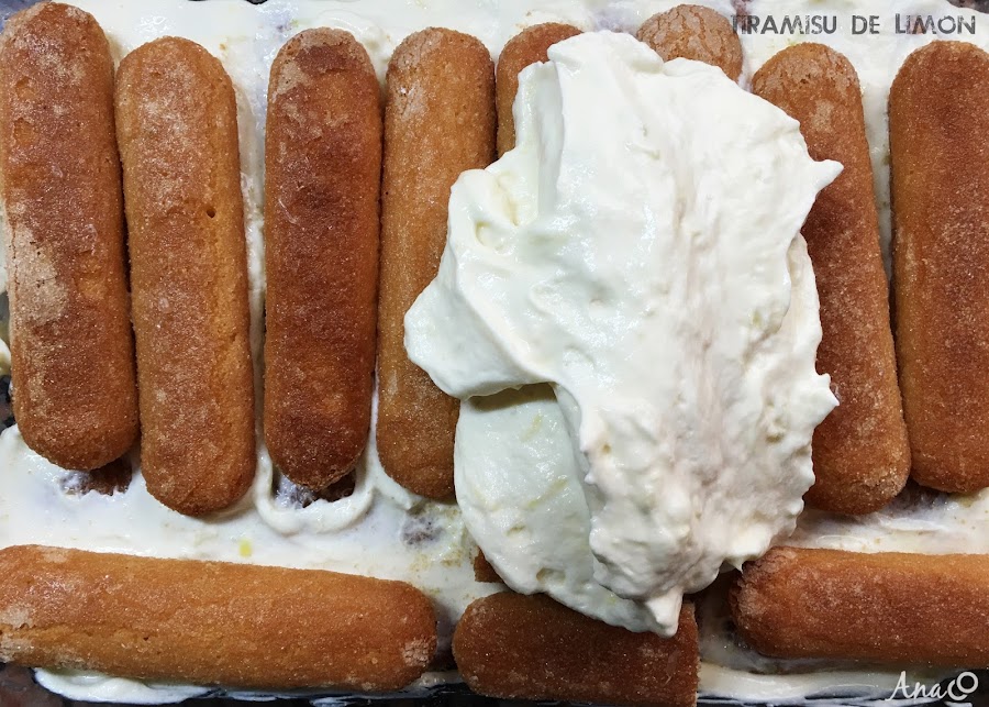 4. En un recipiente de cristal colocamos una capa de bizcochos y los empapamos muy bien con la mezcla cítrica del paso 3 y luego cubrimos con la crema de mascarpone del paso 2. Repetimos la misma operación de nuevo (bizcochos + mezcla cítrica + crema mascarpone)