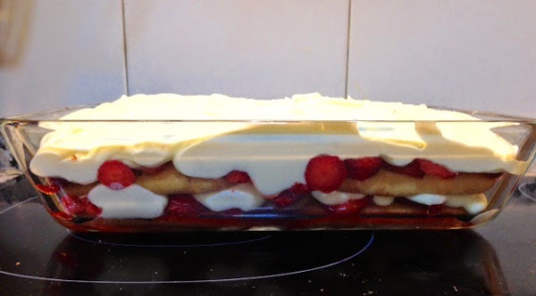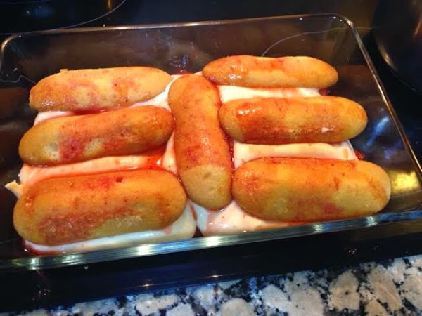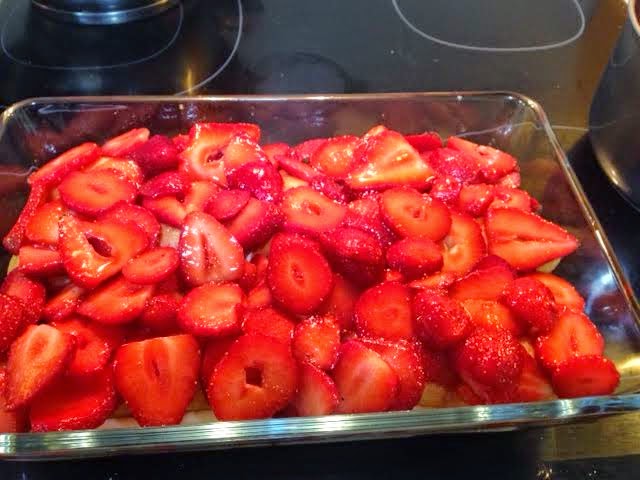 En un motllo, millor rectangular o quadrat, posem una capa de melindros i els reguem amb el suc de les maduixes, a continuació posem una capa de maduixes i després una de la barreja, després posem una segona capa de melindros i fem la mateixa operació, reguem els melindros amb el suc, posem una capa de maduixes i finalment una altre de barreja.