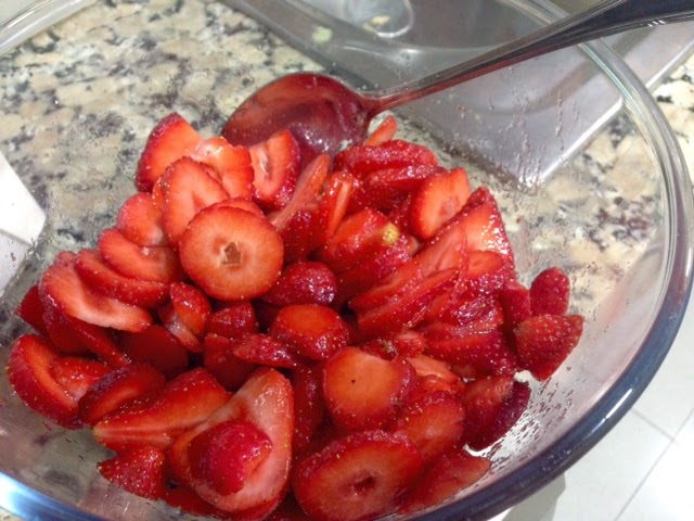 tallem les maduixes a làmines i les posem en un recipient amb el suc de mitja llimona, evitant que caiguin els pinyols, i 40 grms de sucre, ho deixem durant una hora que la maduixa vagi suant i anem remenant de tant en tant.