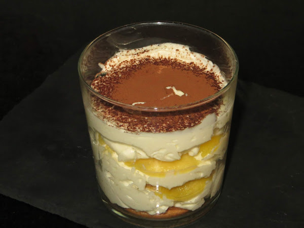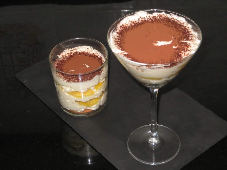 Ahora montamos el postre, en este caso lo he realizado en vaso para que sea más sencillo comerlo, pero también se puede hacer en forma de tarta, se baña una galleta en el café y el ron y se pone en la base, se le echa la mezcla de huevo, azúcar y mascarpone y una capa de mango. Se hacen tantas capas como uno quiere y se termina con una de crema para echar el cacao por encima. Se mete a la nevera y se saca justo antes de servir.
