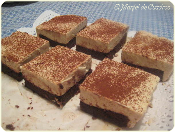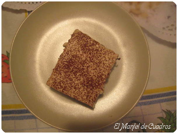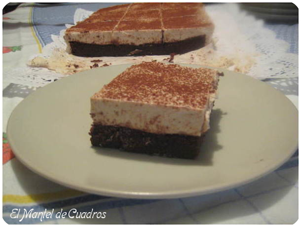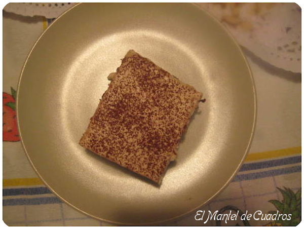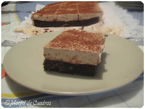 Volcar todo sobre el fondante de chocolate y refrigerar hasta que la mezcla del queso adquiera la consistencia necesaria, no hay que pasarse en la refrigeración pues podría endurecerse mucho el fondante. Y si sobra algo que hay que guardar en la nevera, sacarlo media hora antes de consumirlo. Para la decoración, yo espolvoreé cacao en polvo por encima.