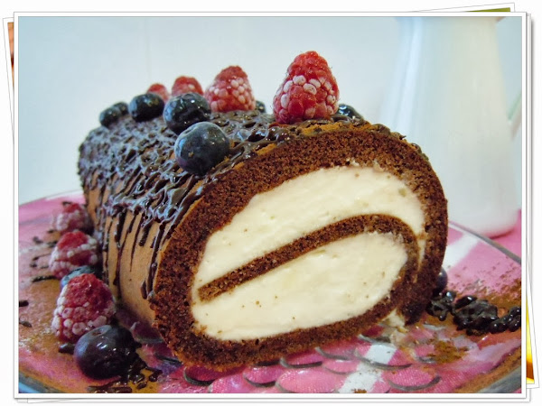 Como veis he elegido un brazo gitano, está humedecido en un almíbar de café con ron riquísimo, relleno de queso mascarpone y nata (crema de leche) y espolvoreado con cacao en polvo, chocolate derretido y decorado con frambuesas y arándanos. Para los que no les gusta el café os gustará, porque está muy flojo de sabor.