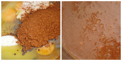 En un bol mezclamos muy bien: los huevos, el azúcar, el cacao en polvo, la cucharadita de vainilla líquida, el peñizco de sal, el aceite y la levadura.