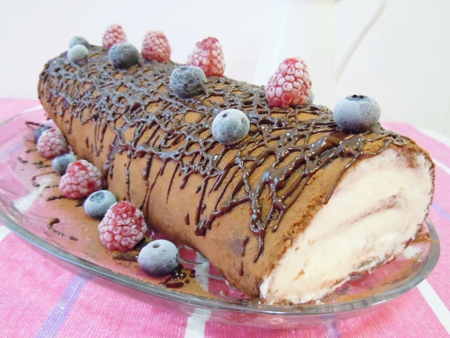 Sacamos el brazo gitano de la nevera, le quitamos el plástico, espolvoreamos cacao en polvo , decoramos como más os guste con el chocolate al libre albedrío y terminamos con la fruta. Listo!!!