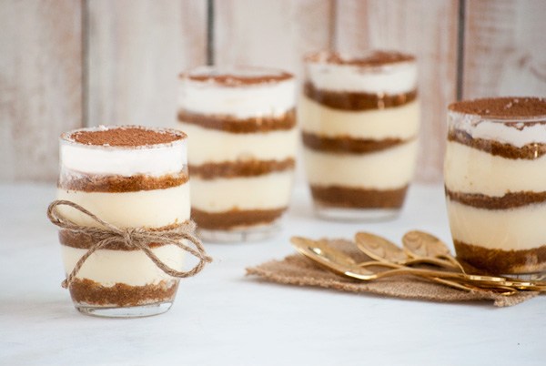 Puede cortar las soletillas al tamaño de los vasos o copas o bien puede molerlas en forma de migas. Vierta el café sobre las migas hasta que esté completamente cubierto. Coloque la mezcla de queso crema encima. Repita esto para otra capa. Para su última capa, agregue las migas y sumérjalas en el café una vez más, pero cubra con crema batida y espolvoree con polvo de cacao.
