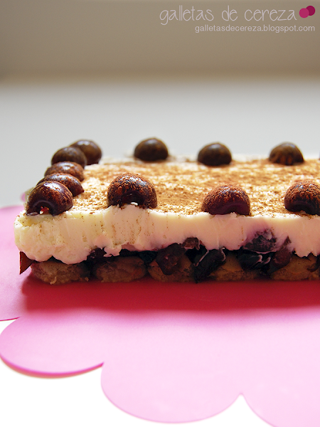 Mezclamos el agua con el amaretto en un plato hondo y mojamos brevemente los bizcochos. Los sumergimos uno a uno durante un segundo y colocamos en la base de nuestro molde. He utilizado un molde rectangular regulable, así lo he ajustado al tamaño de los bizcochos.