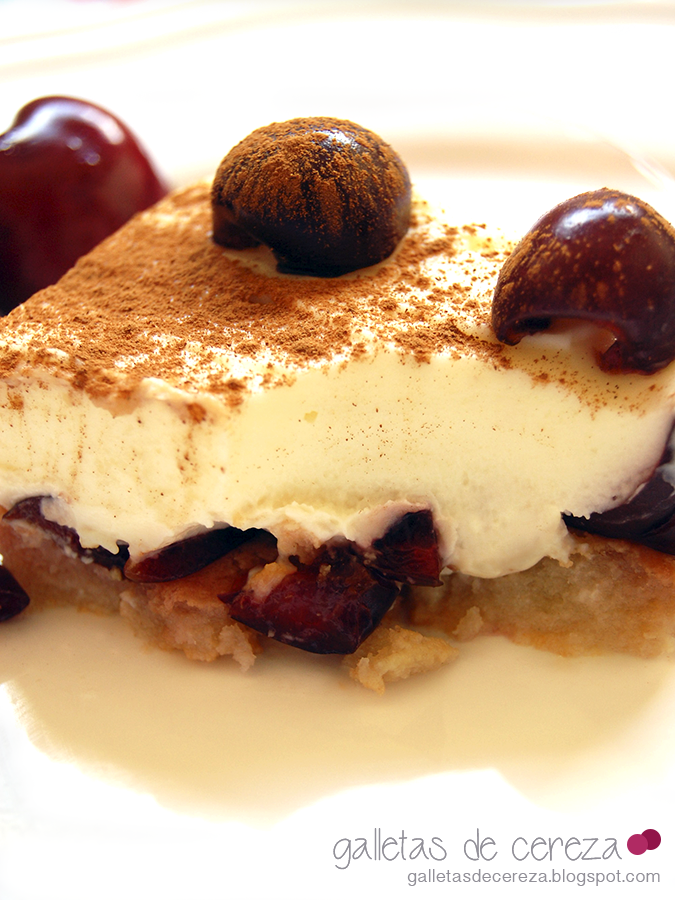 En un cuenco mezclamos los dos quesos con el azúcar glass con una cuchara y cubrimos las cerezas con esta crema. Decoramos con las mitades de cereza escurridas y lo dejamos en la nevera hasta la hora de servir.