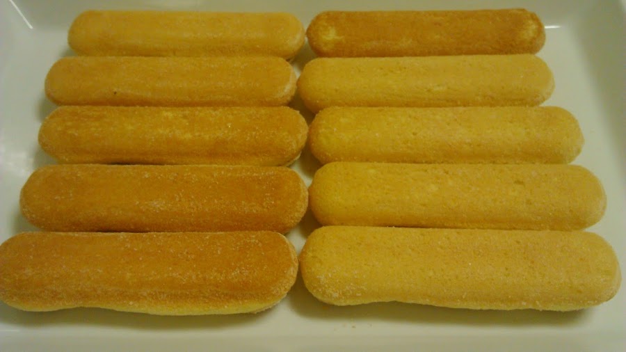 En una fuente o bandeja, donde vayamos a servir, colocamos la mitad de los bizcochos, tapando toda la base.