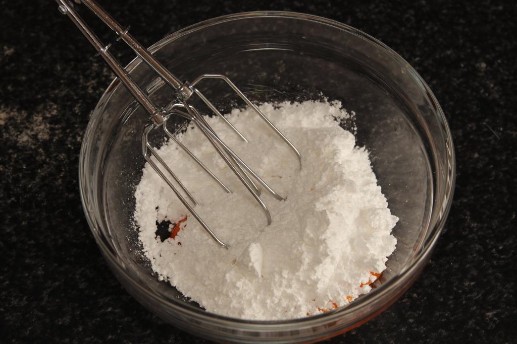 En un bol amplio ponemos las yemas de huevo junto con el azúcar, batimos con unas varillas eléctricas hasta que el huevo blanquée y duplique su tamaño. Incorporamos el queso y seguimos batiendo, hasta que quede una crema homogénea.