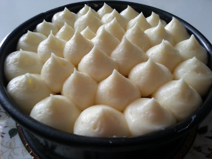 6. - Y volvemos a cubrir con la crema de queso, yo esta última capa se la he puesto con una manga pastelera con boquilla lisa, que queda más "mono".
