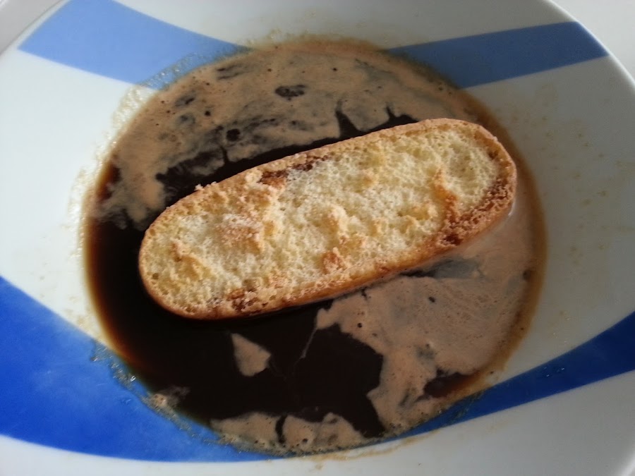 3. - Y pasamos al montaje...pasamos los bizcochos rápidamente por el café, que tendremos en un plato. Si Tardáis mucho se os deshacen.