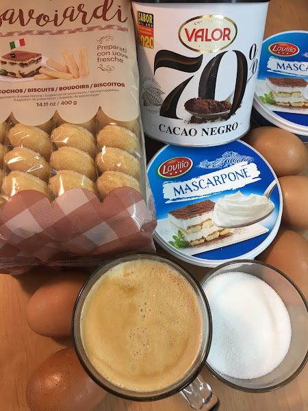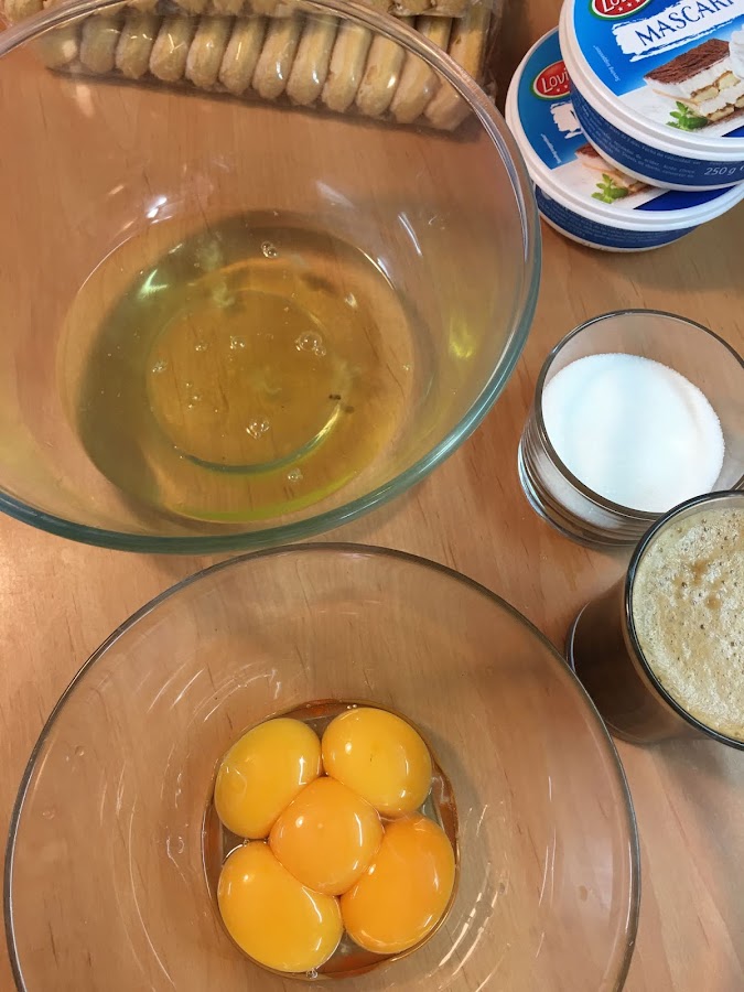 Así aparecen dos capas diferenciadas y separadas por otra capa de bizcochos savoiardi empapados en café. Esta vez, además, encontré en un comercio italiano los bizcochos y los llevé para hacer el tiramisú auténtico.