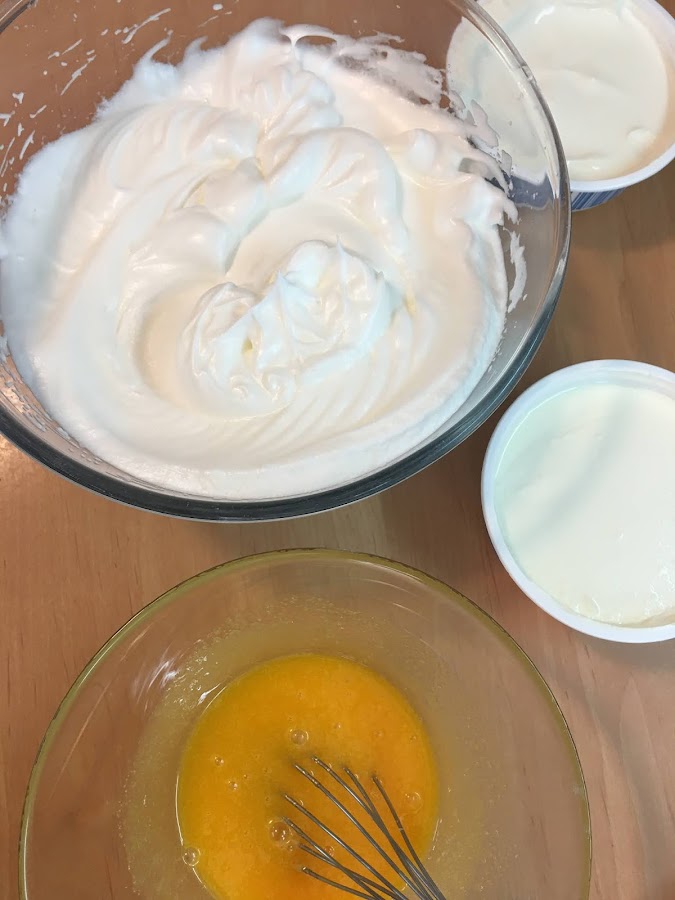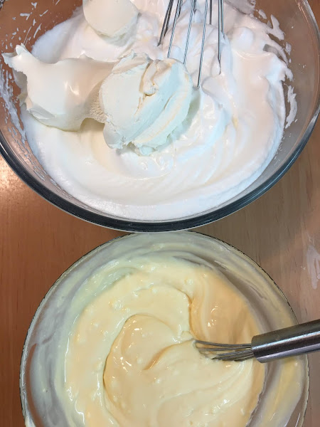 Se añade una tarrina y un poco más de queso mascarpone a las yemas y el resto de esa tarrina a las cñaras montadas.