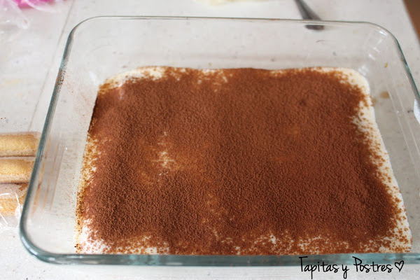 Encima ponemos una capa de crema de mascarpone y espolvoreamos cacao a través de un colador.