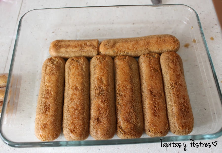 Ahora montamos el postre, en una fuente de cristal ponemos una capa de bizcochos que previamente hemos remojado en el café.