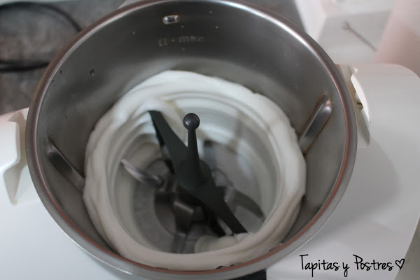 Seguimos montando las claras. Las ponemos en el vaso de la thermomix y las montamos durante 2 minutos a velocidad 3 y 1/2. Podemos montar las claras también con una batidora de varillas. Las reservamos.