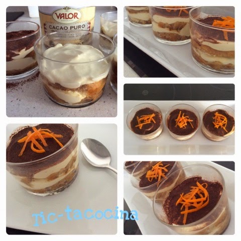 Mezcla en un bol el queso, el azúcar, el vino dulce, la esencia de vainilla y el zumo de naranja (de una naranja pequeña ). Una vez la mezcla del queso esta preparada, solo hay que montar la tarta, intercalando capas de bizcochos que hay que ir mojando con una brocha de café azucarado ( el café debe estar frio ), de crema de queso y de cacao puro, hasta terminar con cacao.