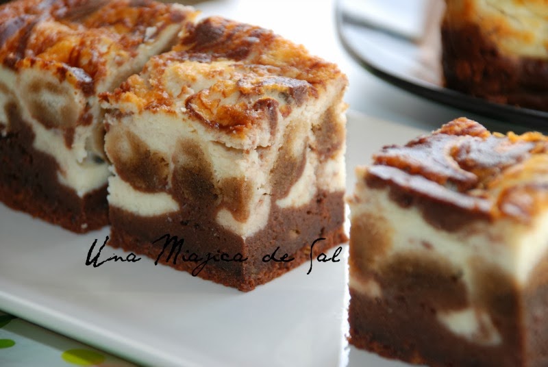 3- Batir los quesos con el azúcar y las claras de huevo, extender la mezcla sobre los bizcochos, sobre la mezcla de queso ponemos pequeños montoncitos de la mezcla de chocolate reservada y mezclamos ligeramente con un palillo.