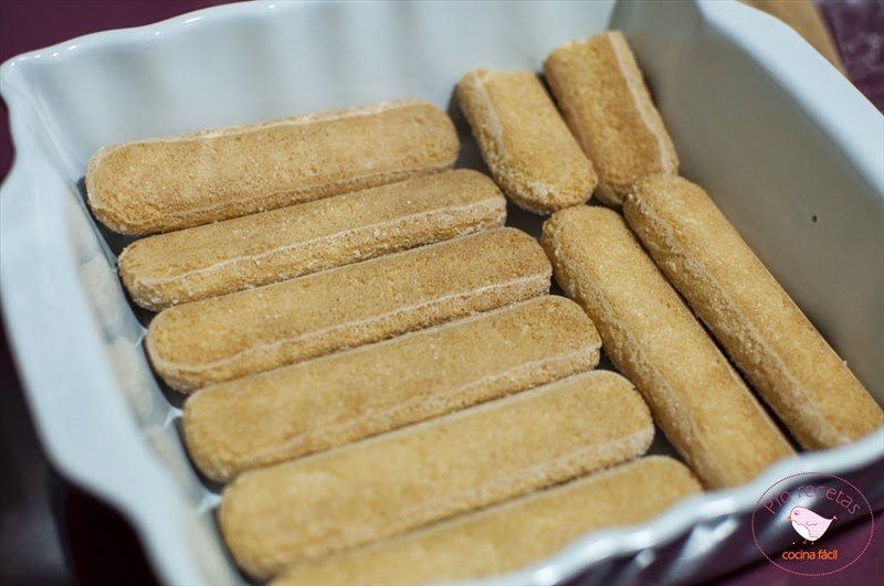 Cogemos un molde y ponemos una capa de bizcochos.Yo he usado este tipo que son galletas que cuando se empapan parecen bizcochos. Podéis usar las que las os gusten.