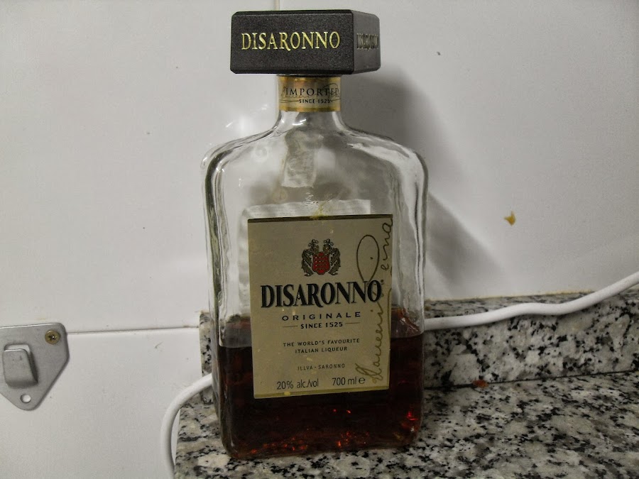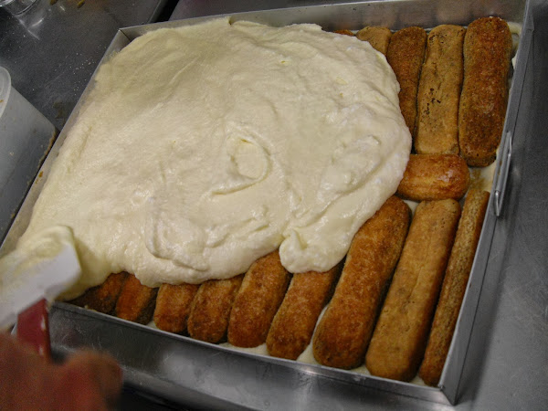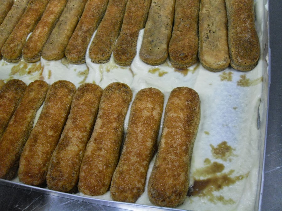 Poner el café en un bol y añadir el licor Amaretto, a continuación mojar en el café ligeramente los bizcochos de uno en uno. Colocar encima de la crema una capa que la cubra.