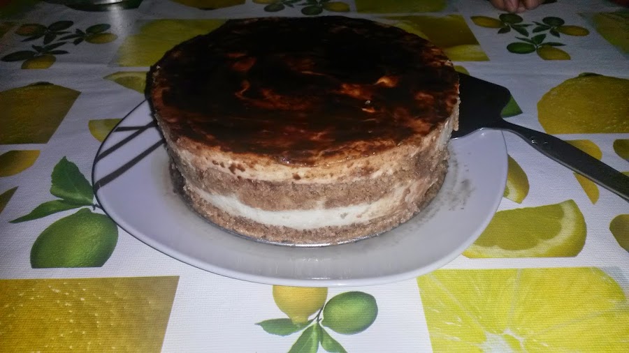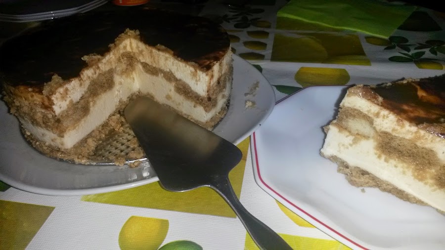 *TRUQUITO* Como mi tiramisú iba a viajar en coche, afiancé un poco la crema con unas hojitas de gelatina neutra derretidas en un poquitín de leche caliente, por eso tiene forma de "pastel" y no de crema suelta.