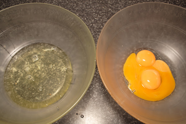 Separamos las claras de las yemas y en un bol montamos estas a punto de nieve con una pizca de sal y reservamos.