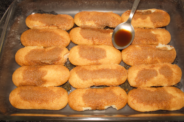 En el molde vamos disponiendo los bizcochos de soletilla y, con ayuda de una cuchara, los empapamos con la mezcla del café y el licor, que queden bien empapados.