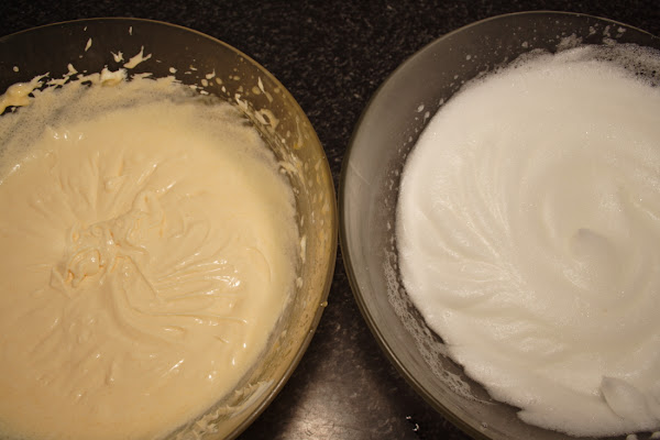 En otro bol grande batimos, con la varilla de batidora, las yemas hasta que dupliquen su volumen y tomen un color blanquecino. Añadimos el azúcar y seguimos batiendo con la varilla. Cuando esté todo integrado, echamos el mascarpone, batimos, hasta que se incorpore y vertemos las claras a punto de nieve. Seguimos batiendo hasta que nos quede una crema melosa. Y reservamos.