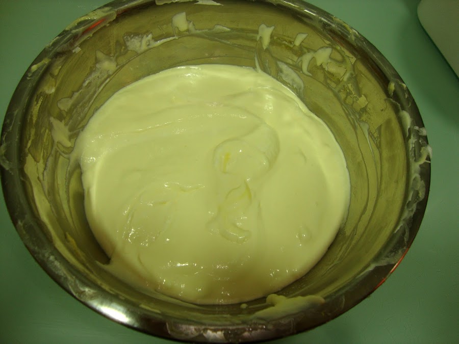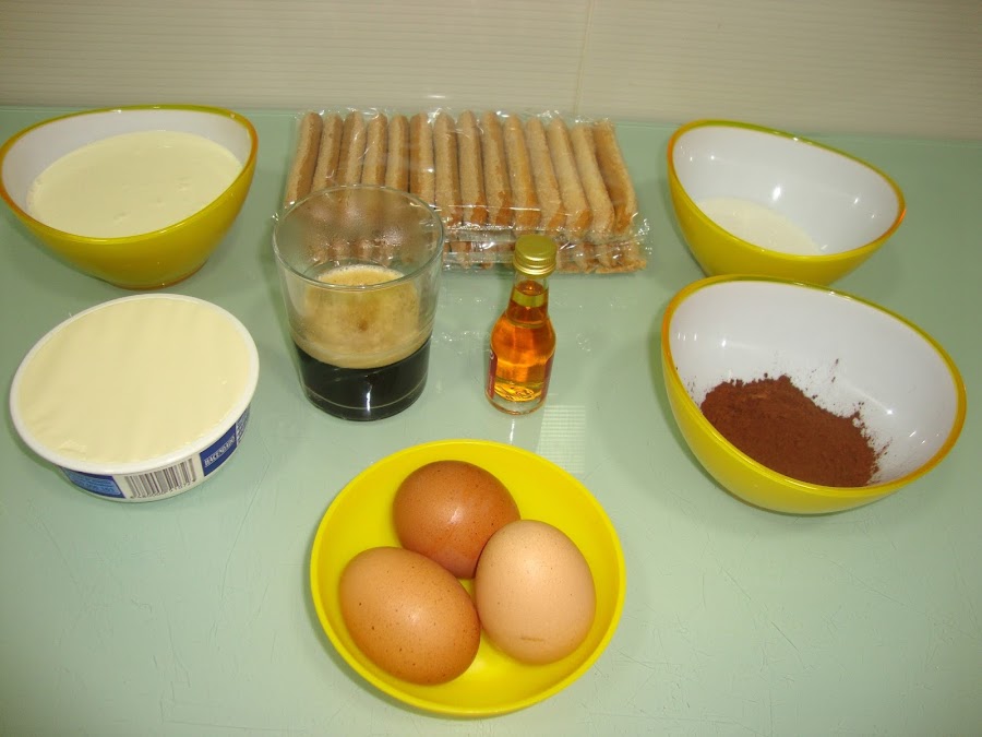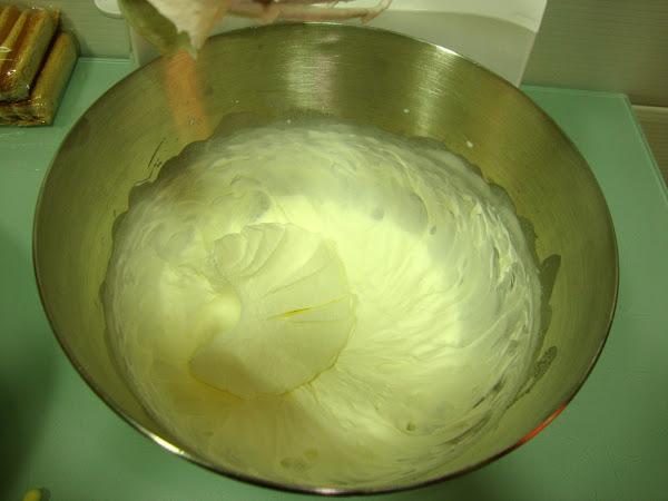 Mezclamos el queso mascarpone con las yemas y 50 gr de azúcar, cuando este cremosos y el queso sin grumos le añadimos las claras montadas y la nata (crema de leche) y lo mezclamos con movimientos envolventes para que no baje mucho la mezcla. Reservamos en la nevera.