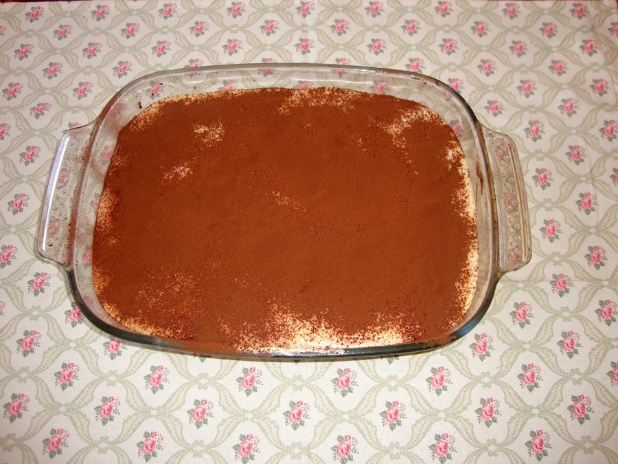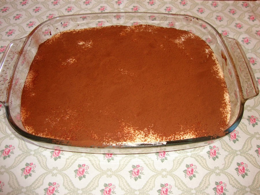 Luego se le añade la crema y si queremos otra capa de bizcochos y otra de crema. Siempre tenemos que terminar en una capa de crema. Finalmente se le espolvorea cacao puro sin azúcar por encima.