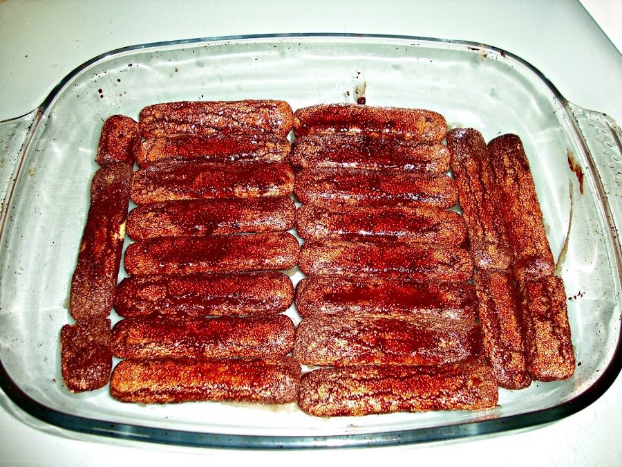 Ponemos en un tazón el café, con el cacao y el licor Amaretto y vamos mojando los bizcochos y poniéndolos en la base de nuestra fuente.