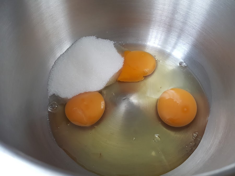 1. - Primero pondremos los huevos enteros junto con el azúcar en la batidora y comenzamos a batir.
