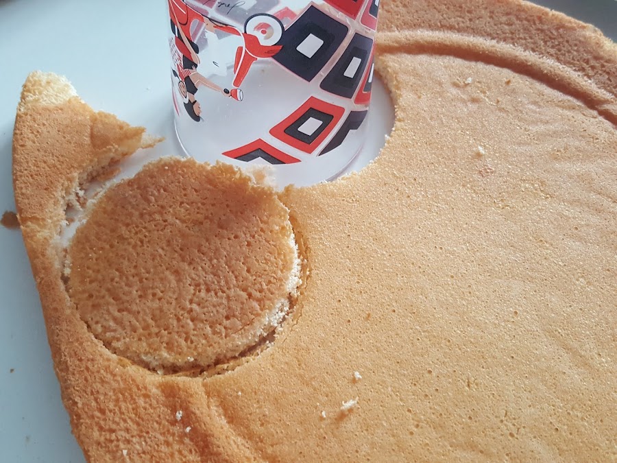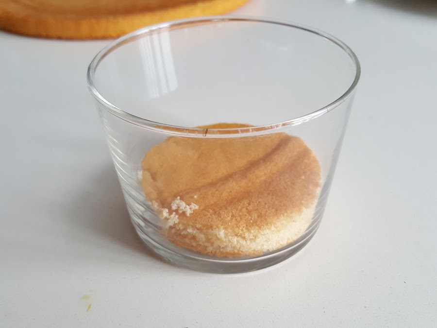 2. - Mientras se baten, vamos recortando el bizcocho a la medida de donde lo vayamos a servir, os pongo aquí vasitos, un pequeño molde.....