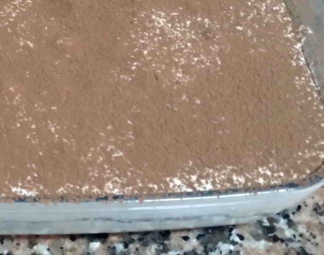 Repetir la operación hasta terminar con todos los ingredientes. Poner en último lugar una capa de mascarpone. Espolvorear toda la superficie con cacao en polvo
