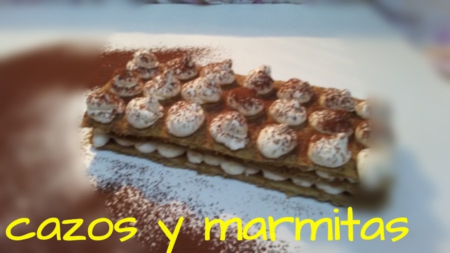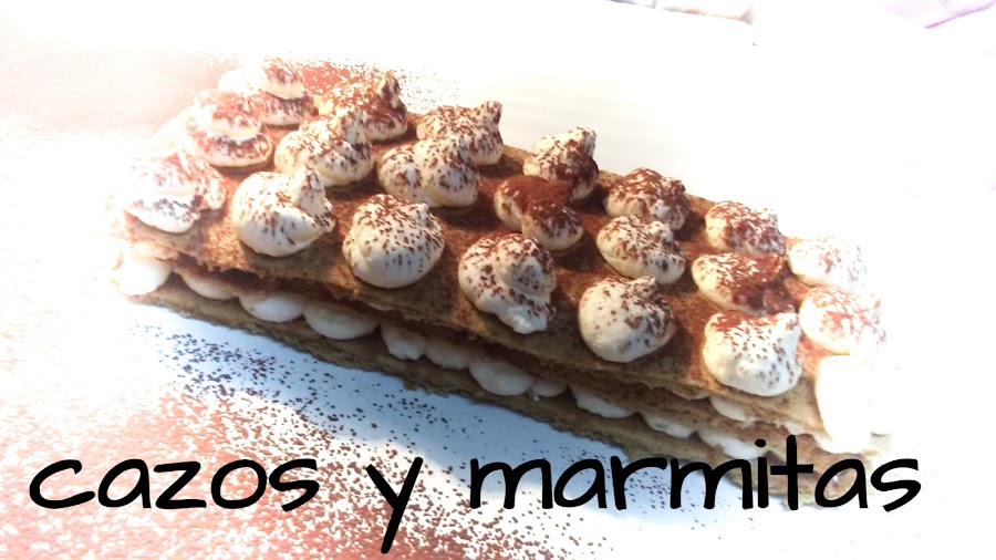 Empezaremos preparando el bizcocho de soletilla, si os fijáis en los ingredientes veréis que hay dos medidas de azúcar, los 23 gr van con las yemas y los 63 gr van con las claras. Dicho esto, empezamos, primero montamos las yemas y los 23gr de azúcar con ayuda de la batidora, hasta que blanqueen, no hace falta que queden del todo montadas. En otro bol montamos las claras y los 63 gr de azúcar, hasta que estén a punto de nieve. Mientras mezclamos la harina con la maicena y el café y reservamos. Cuando las claras estén bien montadas las empezamos a mezclar con la mezcla de los huevos, es muy importante no hacerlo de golpe para que no se nos baje la mezcla. Lo ideal es ir añadiendo un poco e ir mezclando suavemente con movimientos envolventes con ayuda de una lengua, cuando se haya integrado esta pequeña cantidad añadiremos un poco más, así hasta lograr incorporar todo el merengue. Finalmente añadimos la mezcla de harina, maicena y café tamizados, al igual que antes lo iremos añadiendo poco a poco y mezclando con movimientos envolventes para que no se nos baje la mezcla en exceso. Vertemos sobre una bandeja de horno cubierta con papel sulfurizado y la extendemos bien con la espátula para que nos quede una capa fina. Horneamos a 200ºC durante 5 minutos aproximadamente. Dejamos enfriar. Ahora con un aro rectangular cortamos las piezas que necesitemos.