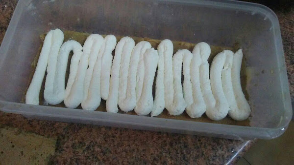 Nota: como no tenía molde rectangular ni cuadrado cogí la forma de un táper para recortar el bizcocho de café.....