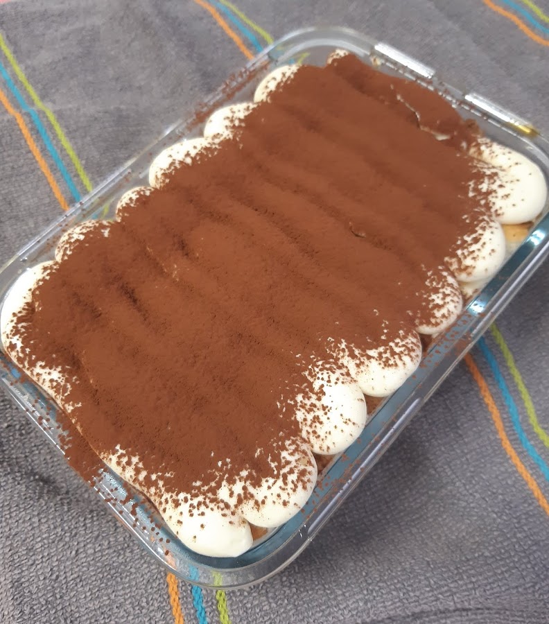Pasamos los bizcochos por el café 3 o 4 segundos,escurrimos bien y ponemos en un molde rectangular una capa entera,después con la manga echamos otra capa de la mezcla y espolvoreamos con el cacao.