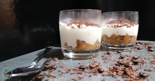 Empapamos, sin exceso, los trozos de magdalenas colocados en el fondo de los recipientes con la mezcla de café y brandy.