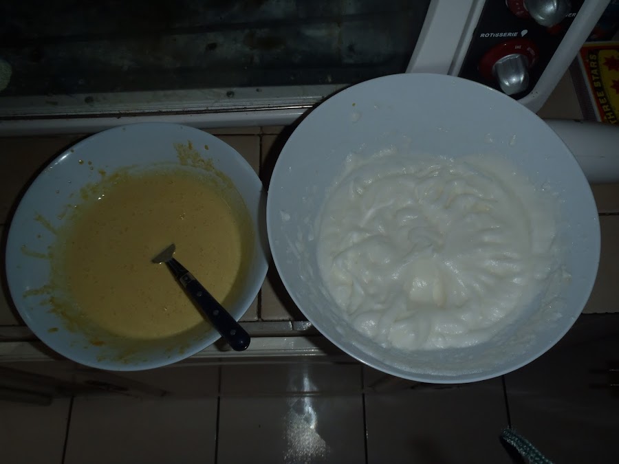 5.- Se echa esta mezcla a las claras (hacerlo muy suavemente intentando no perder el volumen del punto de nieve, mezclar también suavemente con una cuchara).