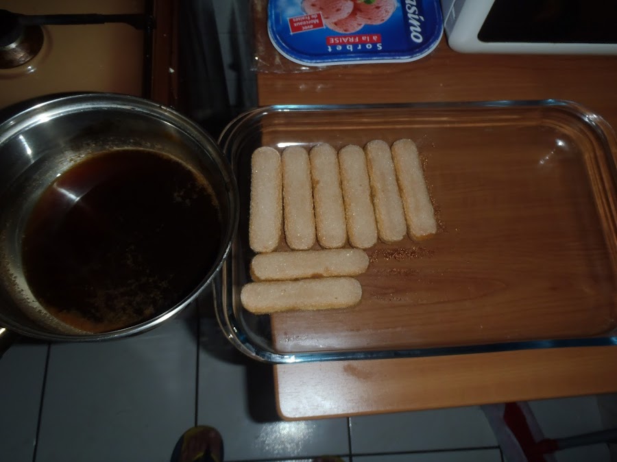 6.- Se hace el café y se moja medio bizcocho en el café y se va poniendo en el recipiente.