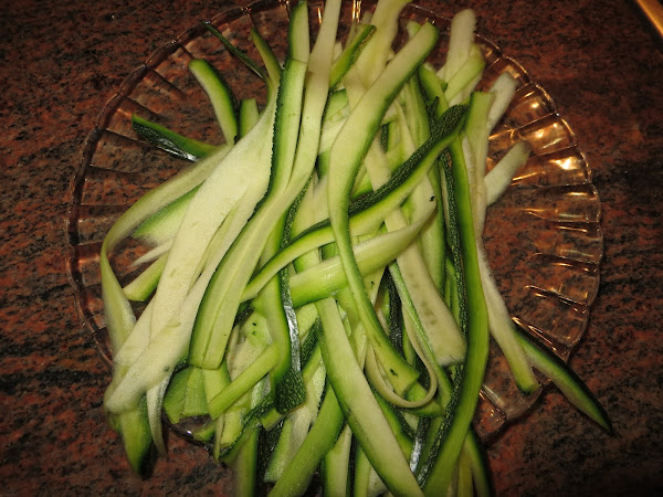Por otra parte, lavamos los calabacines, despuntamos y pelamos con el pelapatatas para que queden lonchas finas. En una sartén echamos los dos dientes de ajo bien picaditos una cucharada sopera de aceite y freímos las tiras de calabacín.
