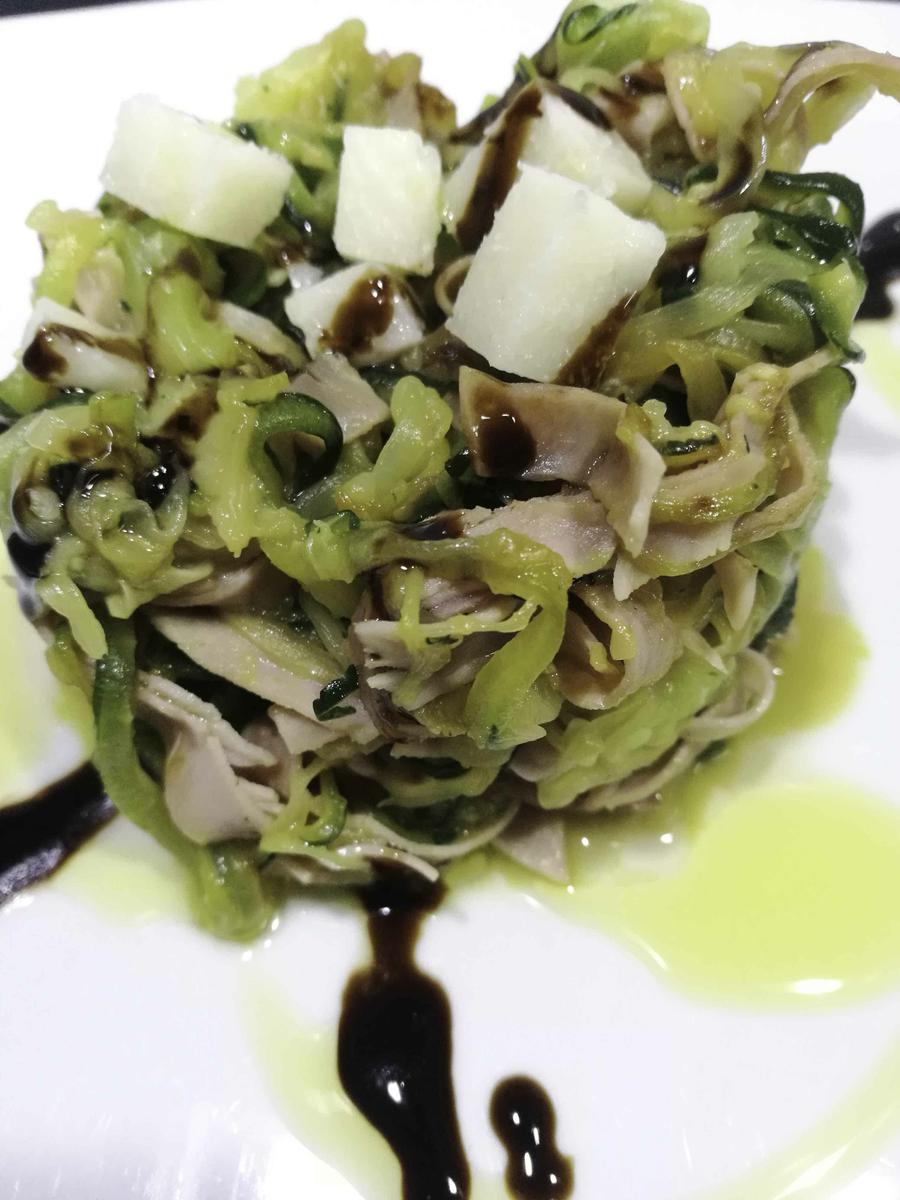 Una vez pasado ese tiempo, emplatamos con la ayuda de un molde, colocando en la parte superior los dados de queso curado y adornando con aceite de oliva y crema de vinagre de módena.