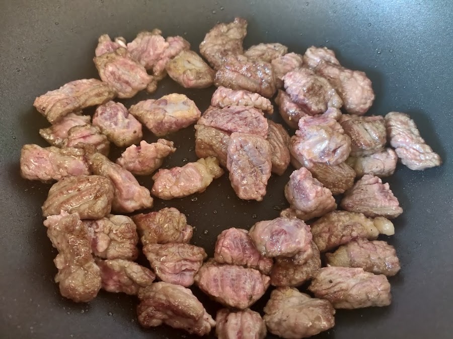 En una sartén con un poco de aceite doraremos la carne. Es importante eliminar el exceso de harina, si lo hubiera, antes de cocinar la carne.