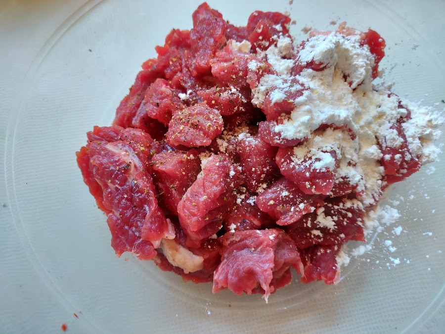 Empezaremos con la carne. Para ello la cortamos en trocitos de un bocado y sazonamos con un poco de pimienta recién molida.