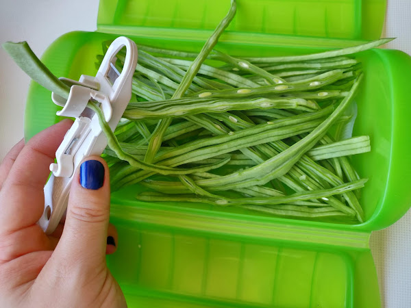 Ahora toca el turno a las judías. Las lavamos y cortamos las puntas y, con la ayuda de una herramienta para laminar judías verdes, sacamos tiras como si fuesen espaguetis.