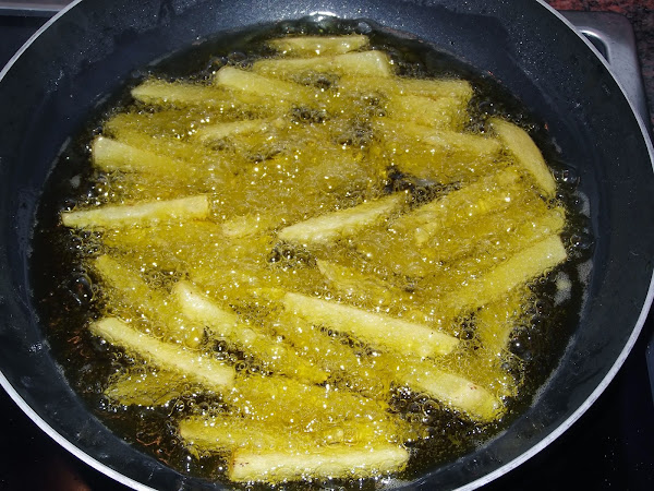 Con las patatas ocurre lo mismo, las saláis y las freís en abundante aceite oliva virgen extra hasta que están doraditas. No os preocupéis si utilizáis mucho aceite, ya que éste lo colocáis y es reutilizable.