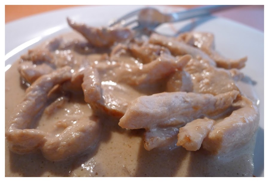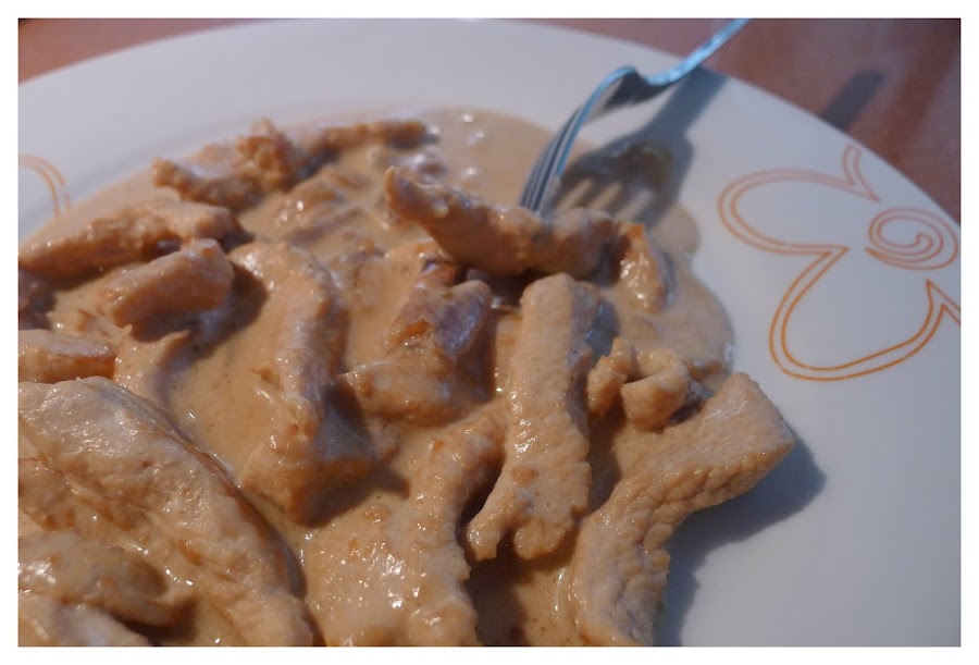 a ver...unos filetes de pavo en la nevera y ninguna ganas de comerlos a la plancha...pues ale con unas laminas de manzana caramelizada,una salsita de nata (crema de leche) y pedro ximenez...manos a la obra y tachan,platito rico en menos de media hora!