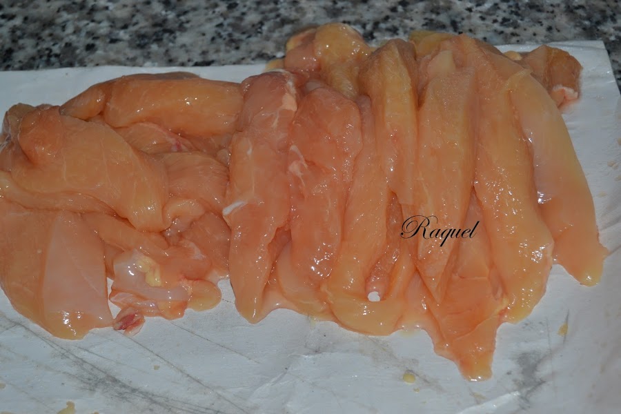 Ponemos la sartén con aceite y freímos las tiras de pollo, las ponemos en un plato con papel absorbente para que absorba los restos de aceite.