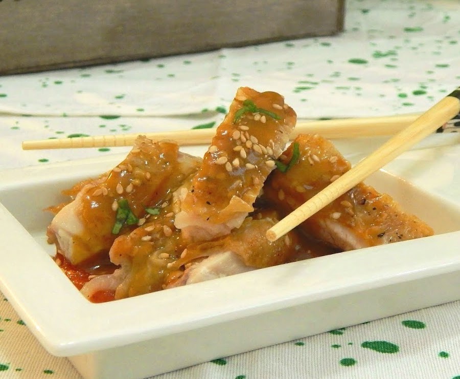 Montamos el plato. En la base la salsa de tomate, encima, haciendo un volcán el pollo cortado en tiras, con la salsa rociada por encima y los granos de sésamo tostado.